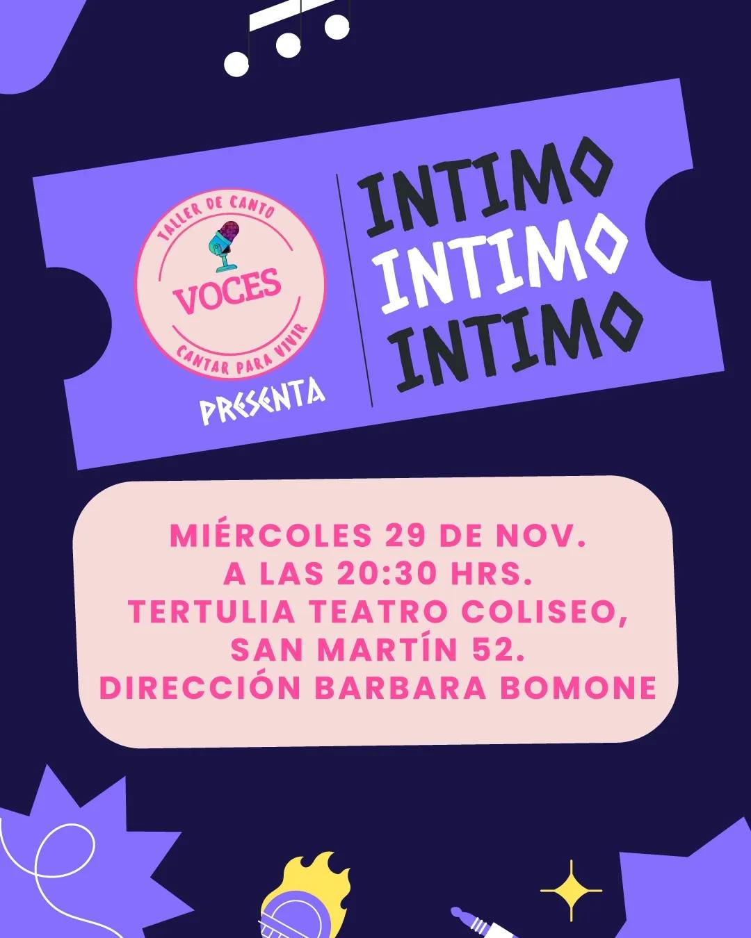 Íntimo, ese es el nombre elegido para un gran espectáculo que prepara como cierre de año el Taller de Canto Voces y que presentará al público el próximo miércoles 29 de noviembre a las 20.30 horas
