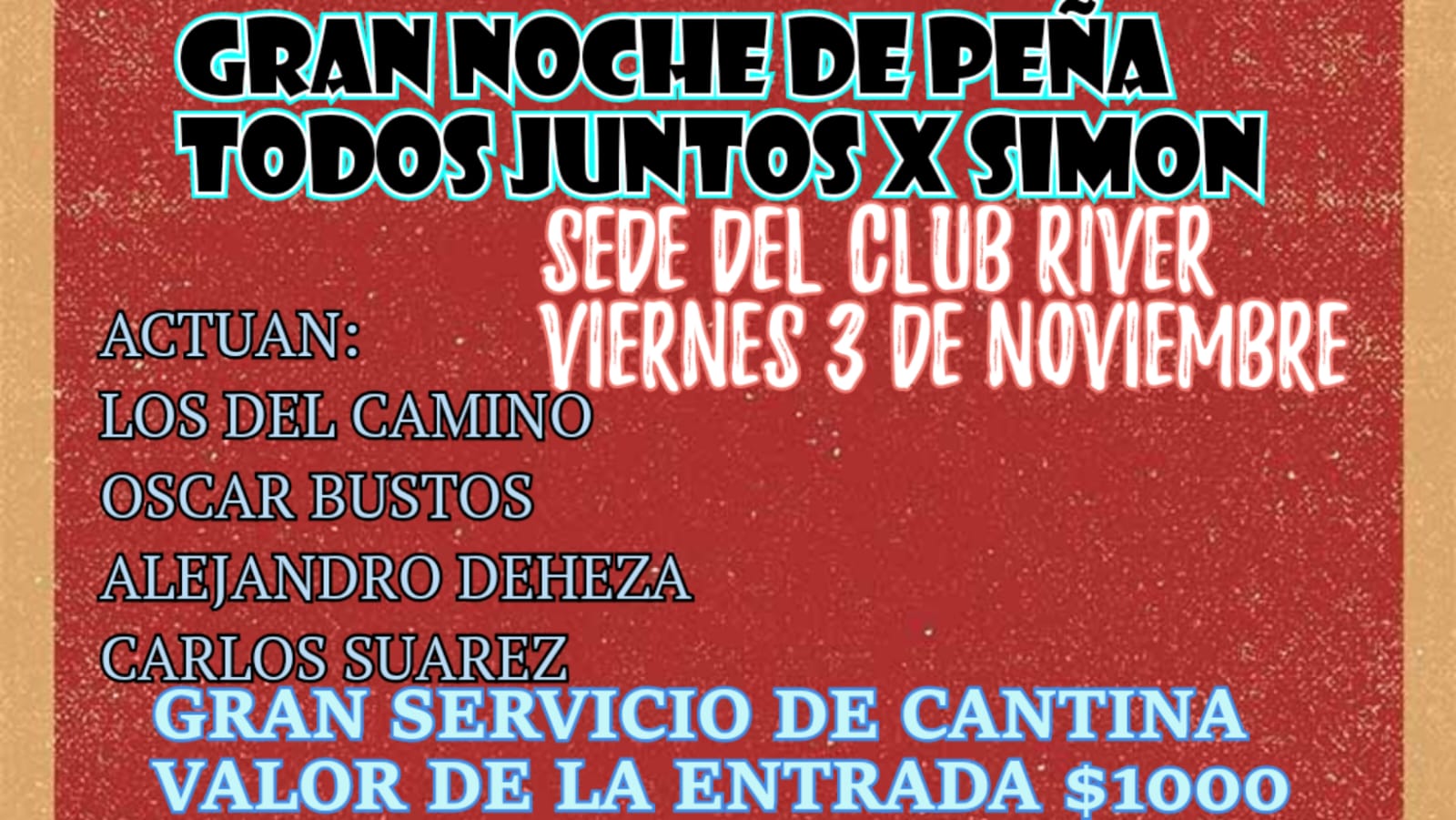 Todo esto hace que la familia de Simón tenga que estar acompañándolo durante todo este tiempo y eso significa un gasto difícil de afrontar. Un grupo de amigos, para colaborar con ellos organizo una peña que será este viernes, en Club River con la actuación de Alejandro Deheza , Los del Camino , Carlos Suarez y Oscar Bustos , con una entrada de $ 1.000 y con gran servicio de cantina.