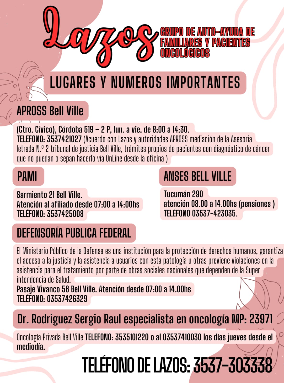 El grupo LAZOS reúne a familiares y pacientes oncológicos para generar acciones en pos de conseguir desde un medicamento hasta el nombre de un profesional , pasando por gestiones para una mejor atención en salud pública o bien para quien tiene una obra social que muchas veces en estos temas no siempre tienen la mejor cobertura