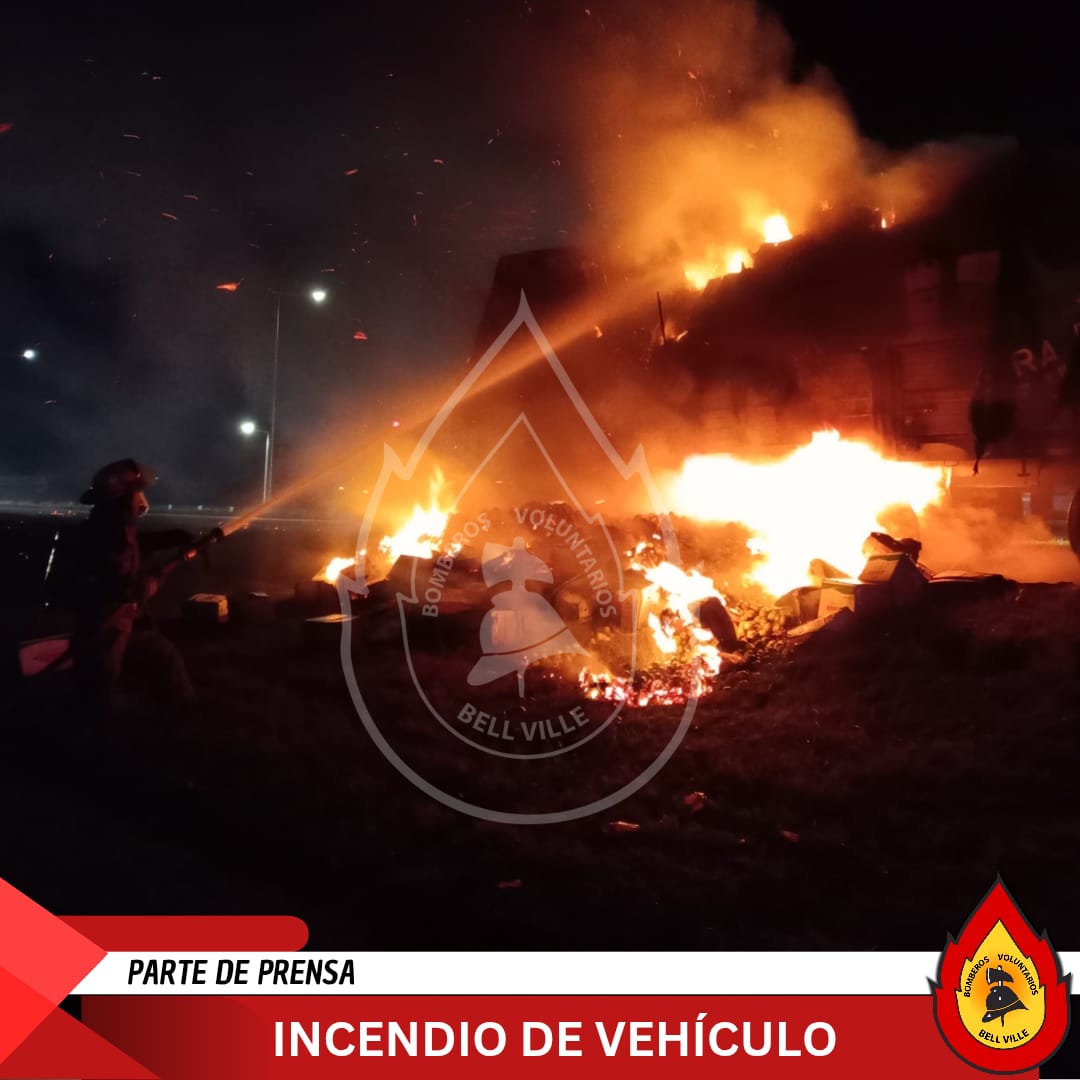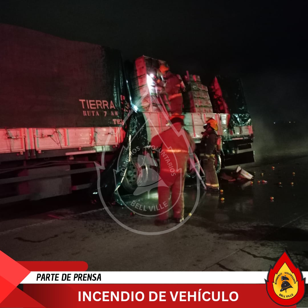 Policía CAMINERA recibió Ilamadas de conductores que transitaban por autopista sobre un principio de incendio de un camión en el km 503 de RN9, sentido cba/ros. Ocurrió en un camión marca Scania con acoplado cargado con limones, siendo el acoplado el que se incendia en su rueda duales traseras derecha, luego de pegarse la cinta de frenos según dichos del conductor de la localidad de Junin-Mendoza. Quien se trasladaba desde la pcia. De Tucumán hacia Buenos Aires. Presta colaboración bomberos voluntarios de la ciudad de Bell ville con 02 dotaciónes extinguen el foco igneo, presente también servicio de emergencia quienes controlan al chófer ya que no quiere ser derivado al nosocomio manifestando estar bien. Se solicita colaboración al corredor vial y se realiza corte de calzada y desvío en el km 504