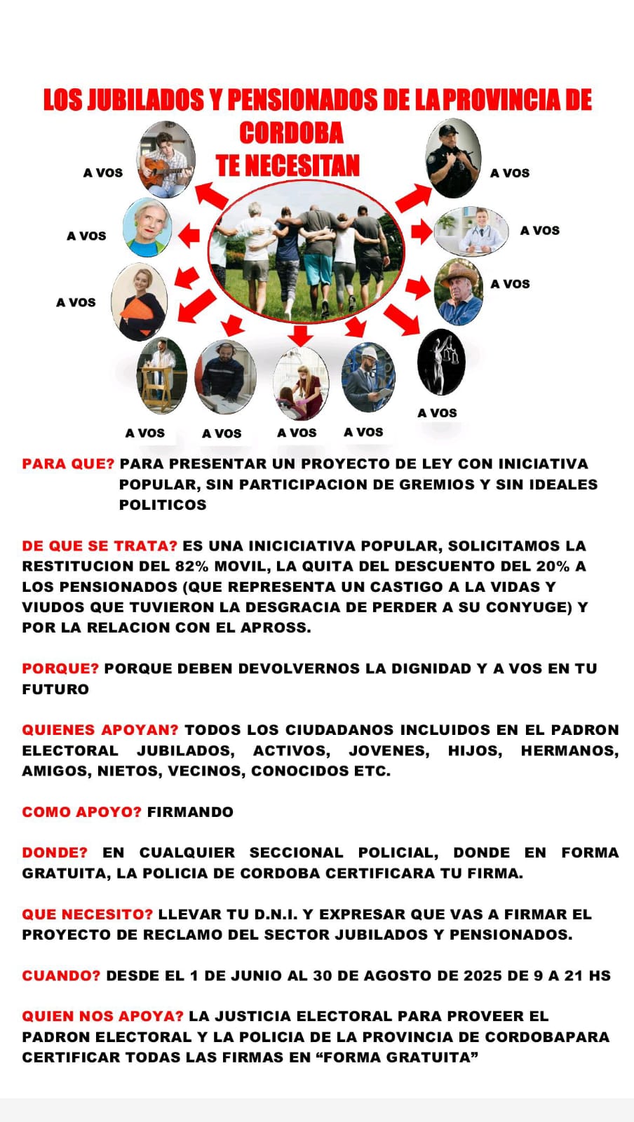Los jubilados provinciales , en este caso docentes , vienen reclamando desde hace tiempo por la restitución del 82% móvil y por otros descuentos que sufren en sus haberes. En el mes de febrero impulsaron con miles de firmas lo que se llama Iniciativa Popular , para que el tema sea tratado en la Legislatura Provincial , pero no prósperó porque las firmas debían estar certificadas . Ahora vuelven a la carga tratando de reunir en toda la Provincia 36.000 firmas o más y entonces si impulsar la Iniciativa Popular.