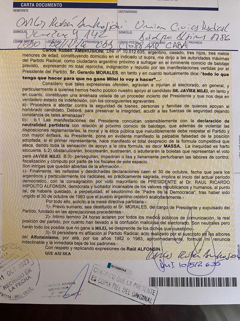 Carlos Ambrosioni , abogado de nuestra ciudad, decidió que esas palabras encerraban una especie de amenaza y el se sintió involucrado, entonces mediante una carta documento , elevada al máximo órgano directivo del Partido Radical , pide la renuncia de Gerardo Morales ya que cree que no puede la máxima autoridad partidaria decir esas palabras , que pueden considerarse , agravantes, hirientes y sugirió que hasta amenazantes , de acuerdo a la actualidad que vivimos