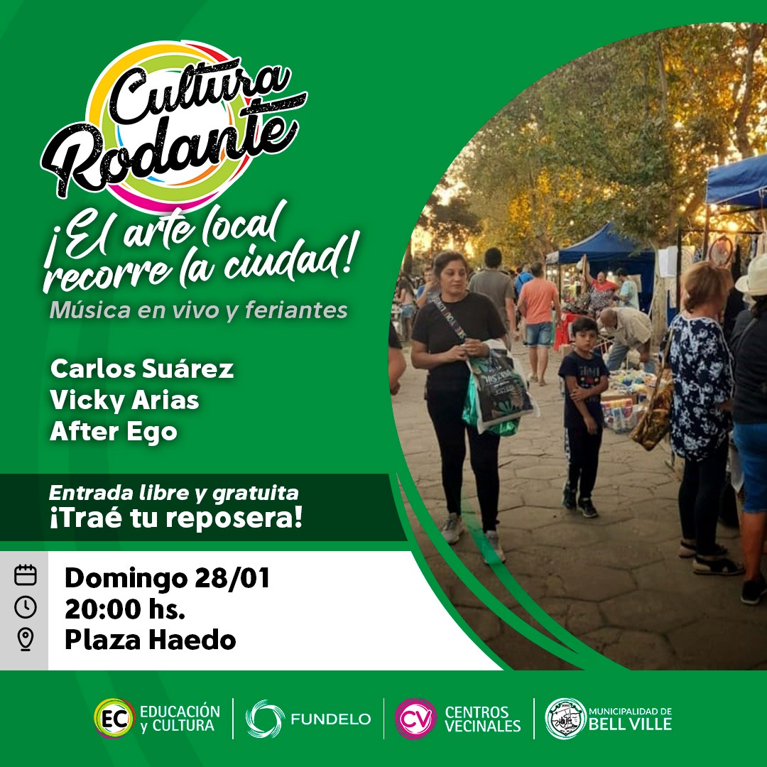 El domingo en Plaza Haedo será otra parada de Cultura Rodante , este ciclo itinerante que promueve la municipalidad con la actuación de AferEgo , Vicki Arias y Carlos Suares .