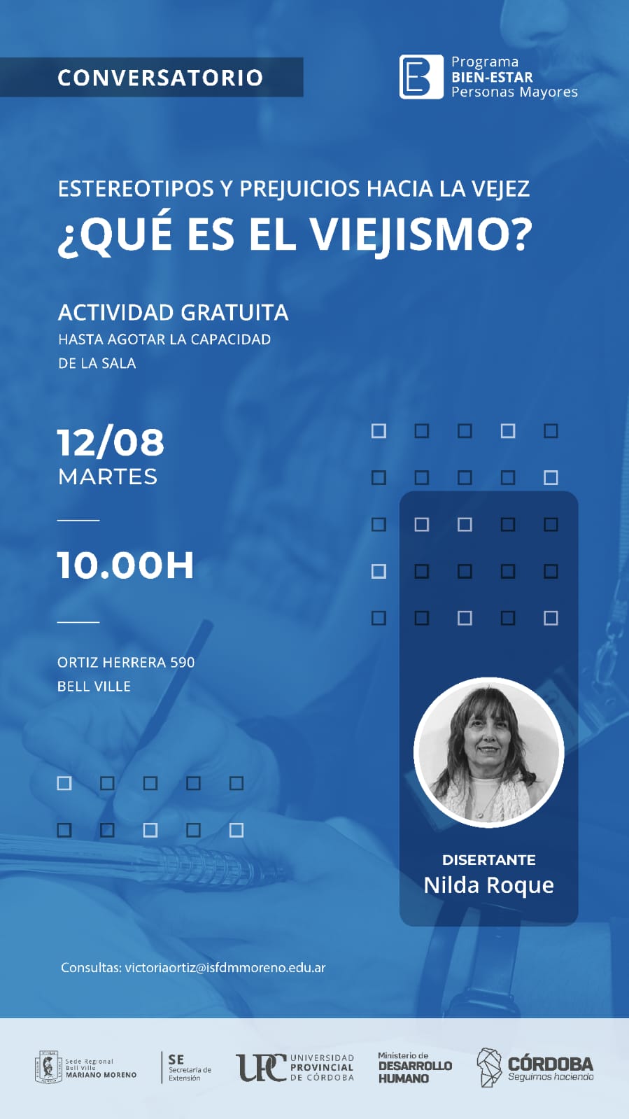 Este martes 12 de agosto , en la Universidad Provincial , tendrá lugar un importante conversatorio sobre un tema de mucha actualidad : "que es el viejismo" dictado por la licenciada Nilda Roque , profesional de la Facultad de Educación y Salud de la UPC . Será totalmente gratuito y para todo público, este martes desde las 10 de la mañana.