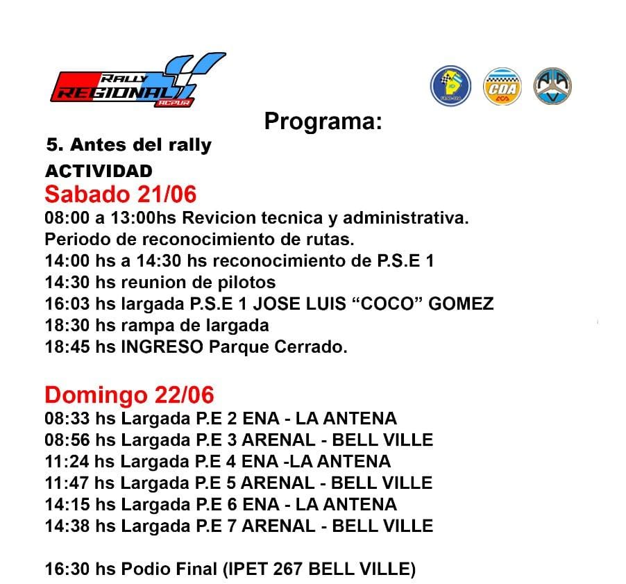 Daniel Dutto uno de los organizadores locales dijo que ya está todo listo para comenzar a disputar el Rally Regional "Dia de la Bandera" . Contó que este viernes 20 al mediodía ya estarán llegando los equipos al parque de asistencia , en este caso será en la ex Enet , y el sábado a las 16 se correrá el especial en la Avda. Angeloz , y luego a las 18.30 todos los autos se encolumnaran para llegar hasta la plaza céntrica y allí habrá una especie de largada simbólica .
