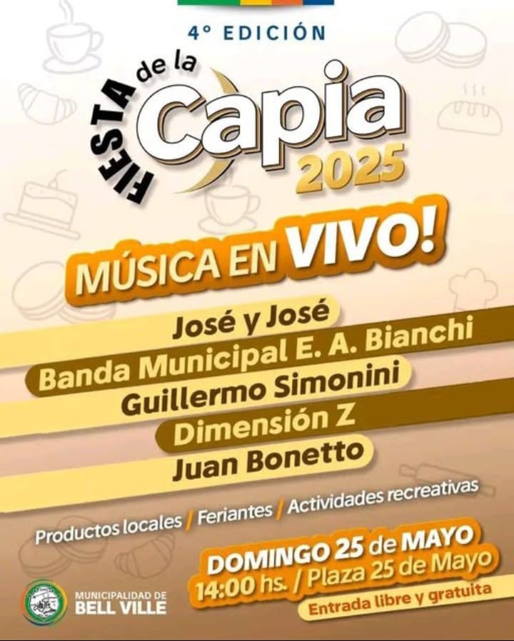 La 4⁰ edición de la Fiesta de la Capia será este domingo 25 de mayo en la plaza del mismo nombre desde las 14 horas y con muchos atractivos para pasar una linda tarde resaltando este producto netamente bellvillense .