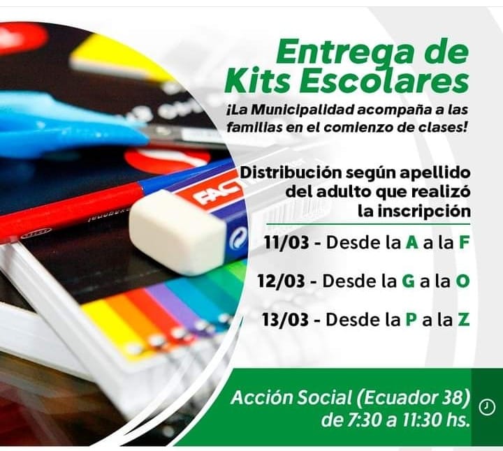 Marcela Barbero , directora de Acción Social , confirmó para este lunes 11 de marzo el comienzo de la entrega de útiles escolares a familias que no pueden acceder a la compra de los mismos y que ya se inscribieron en el mes de enero y cumplen con los requisitos solicitados por el municipio para recibir este beneficio