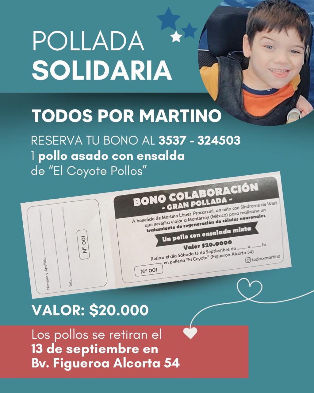 Antonella , mamá de Martino , inició hace un tiempo una campaña mediante la cual ya recaudaron más de $ 15 millones y ahora quieren reforzar esta acción con una gran pollada , contando con la colaboración de un negocio del rubro, "El Coyote".