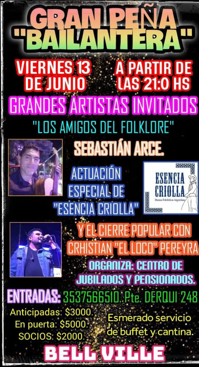 Con la idea de pasar un buen momento este viernes 13 a las 21.30 horas en Centro de Jubilados se realiza lo que dieron en llamar "peña bailantera". Llama la atención el nombre dijo la presidenta de la institución Marissa Villarroel y contó que pretenden pasar un buen momento , con folclore , tango , danzas y música para bailar.