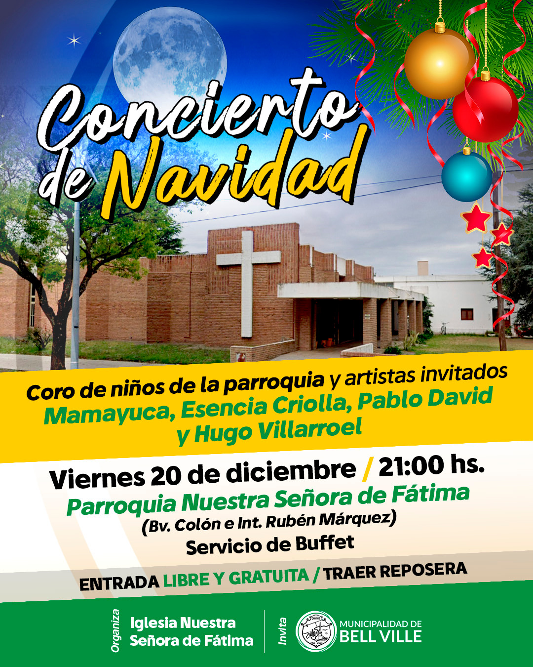 Contará con la Participación del Coro de Niños de la Parroquia , dirigido por Macarena Martinez , donde interpretarán villancicos clásicos. Además estarán en el escenario el grupo de folclore Mamayuca , la voz de Hugo Villarroel , el Ballet Esencia Criolla y el cierre será con música bien bailable a cargo de Pablo David .