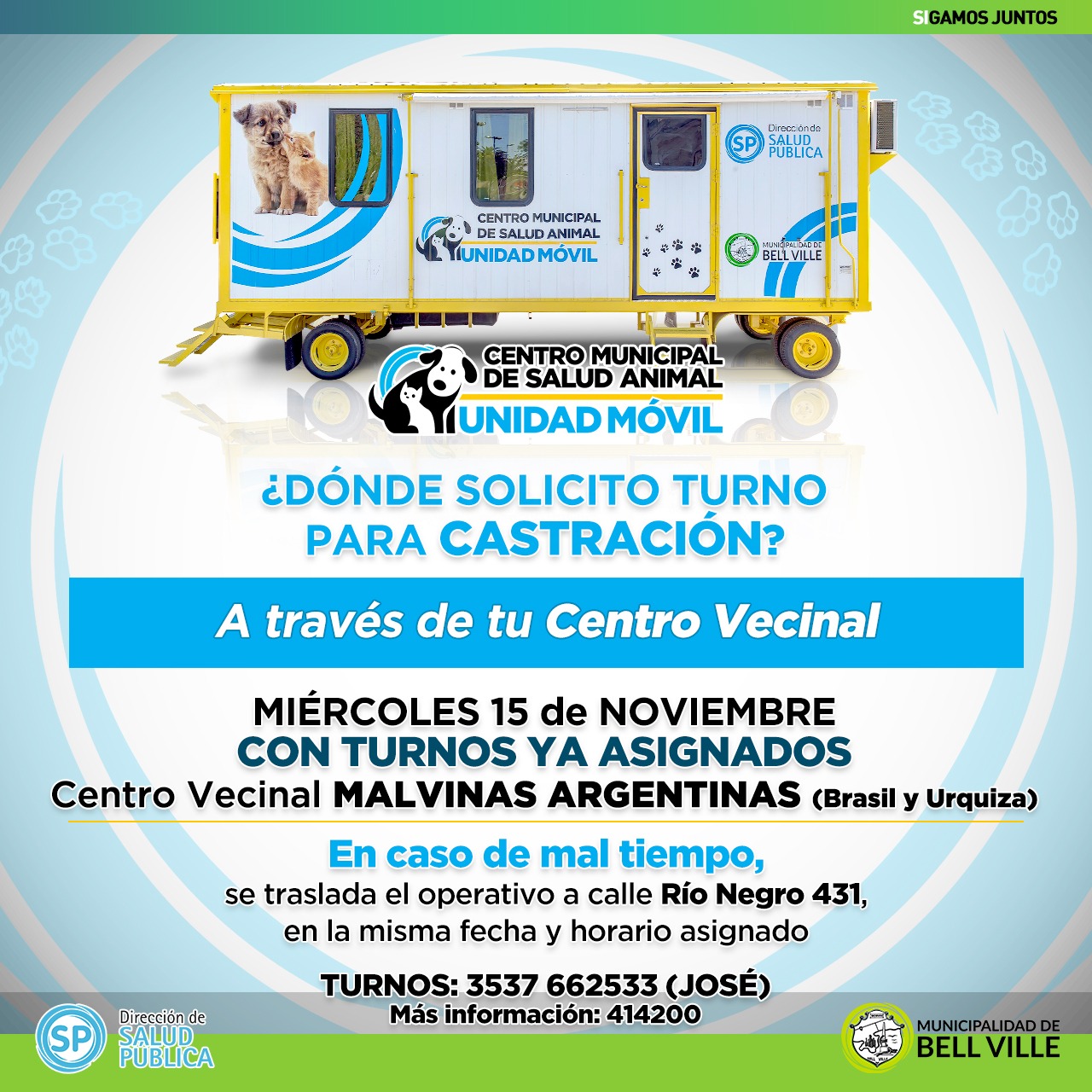 Jose Carballo , presidente del CV Malvinas Argentinas, invitó a los vecinos del sector a aprovechar para castrar a sus mascotas, ya que este miércoles 15 de noviembre, el castrador móvil estará en el lugar . Para los turnos los vecinos pueden comunicarse al 662533. LA tarea comenzará a las 8.30 horas
