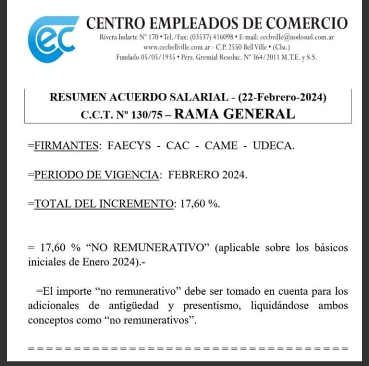 Pablo Aravena , Secretario del Centro Empleados de Comercio de nuestra ciudad , dijo a LA2000 que luego de la reunión de las distintas partes interesadas llevada a cabo el último jueves 22 de febrero se alcanzó una recomposicion salarial del 17,6 % sobre el sueldo de enero y a partir del 1 de febrero
