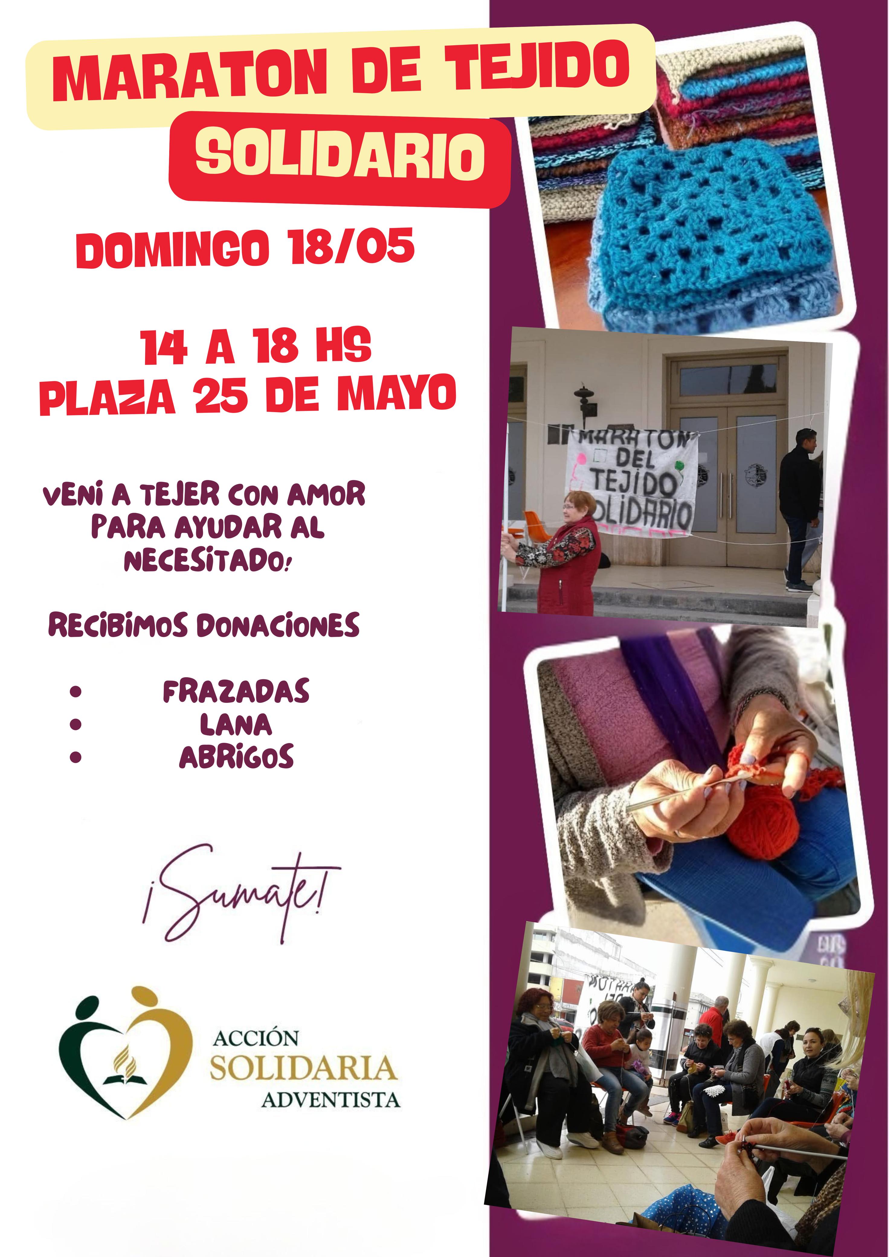 Con la organización de ASA , Asociación Solidaria Adventista , perteneciente a la Iglesia Adventista de nuestra ciudad , se pondrá en marcha la Maratón de Tejido , de 14 a 18 horas en plaza 25 de mayo.