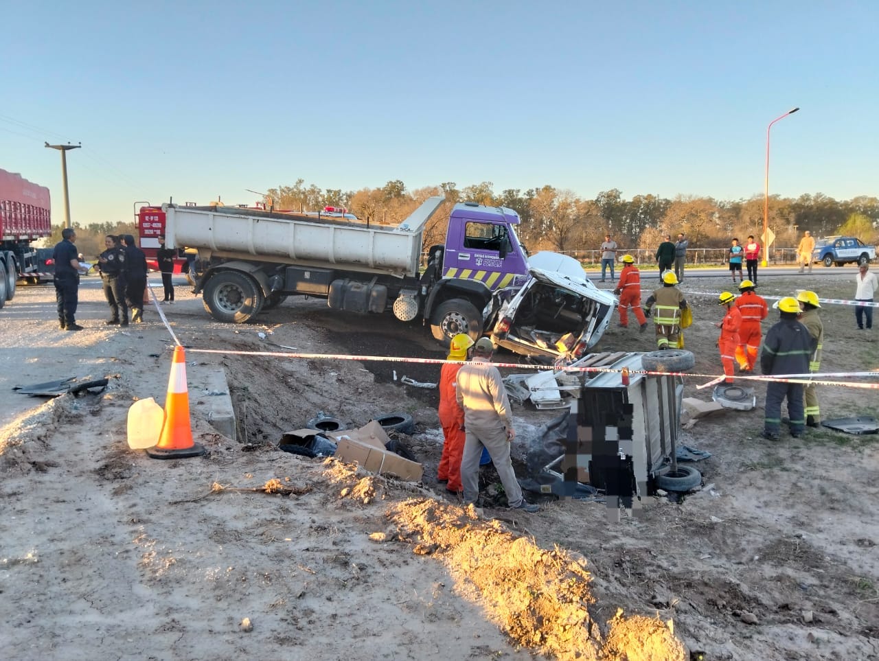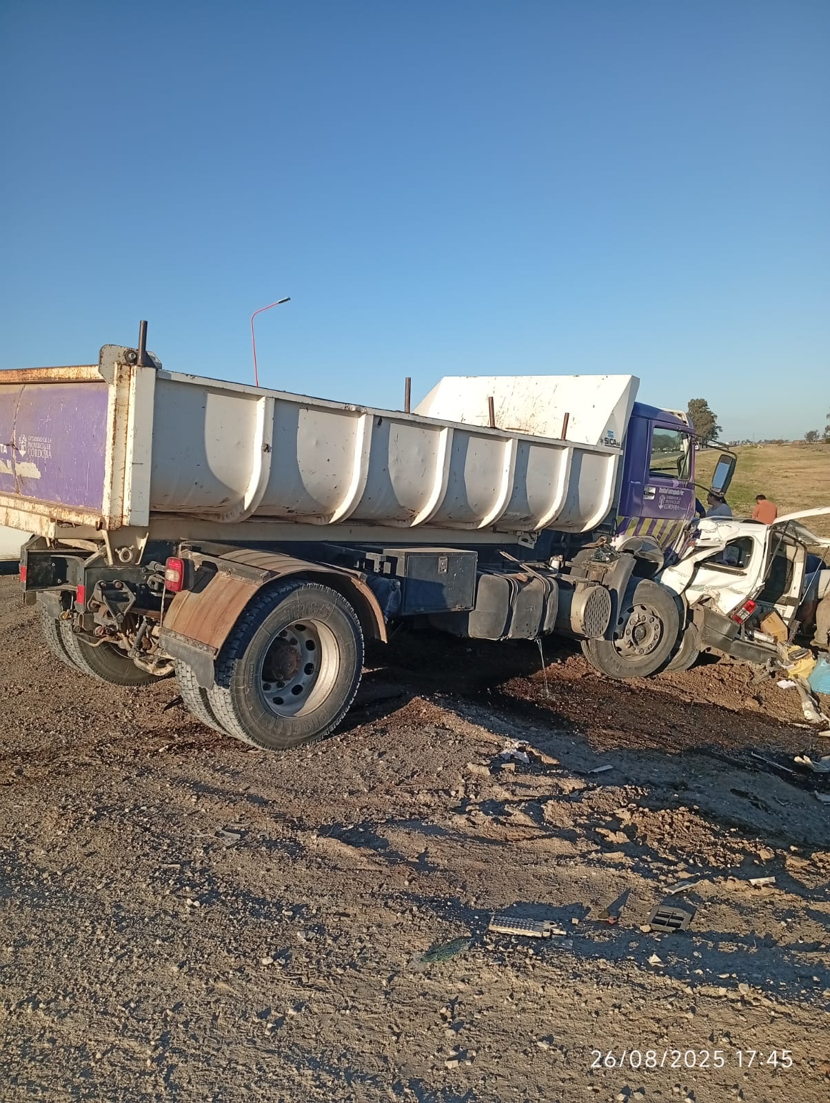 Se comisiona personal policial, tras alerta al número de emergencias, en ruta provincial Nº 2, acceso oeste de la localidad, constatando un accidente de tránsito, donde por causas a establecerun camión Volkswagen, tipo volcador conducido por un ciudadano de 44 años de edad, colisiona con un vehículo utilitario marca Peugeot Partner, guiado por un masculino de 52 años de edad, acompañado por una femenina de 82 años de edad. A raíz del siniestro todos los involucrados fueron trasladados al hospital de la ciudad de Bell Ville, donde tras ser asistidos por personal médico, se diagnostica lesiones de carácter leves para el conductor del camión y para la femenina acompañante del rodado menor, en cuanto al conductor de este último (peugeot partner), permanece internado en observación, habiendo sufrido varias lesiones, y heridas cortantes, sin correr riesgo de vida. Trabajaron en el lugar servicios de emergencia, bomberos voluntarios y policía judicial, con conocimiento e intervención del magistrado judicial interviniente.