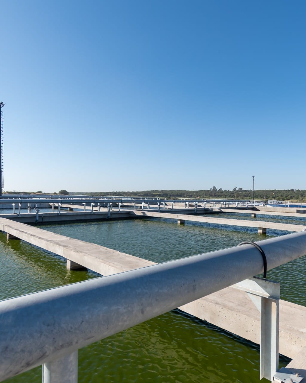 TRATAMIENTO SECUNDARIO O BIOREACTOR: es el bloque más complejo y dinámico. Está compuesto por 8 piletas de aireación de 60 m por 20 m, con su sala de sopladores, las unidades de recirculación de lodos, y las baterías de tanques sedimentadores secundarios o clarificadores. Esta batería son 6 mega-tanques de más de 50 m de diámetro.