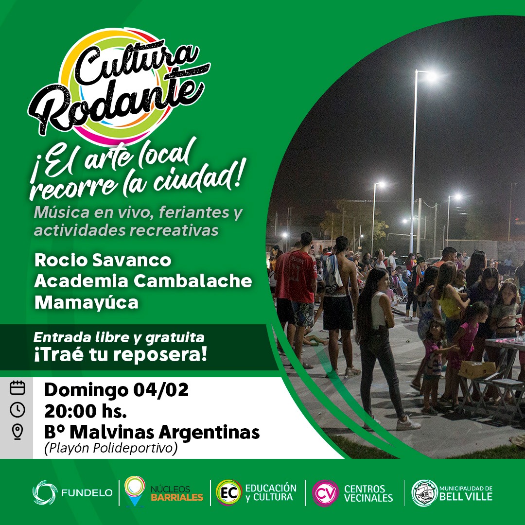 Nueva parada de la propuesta municipal ,Cultura Rodante . Esta vez en el playón polideportivo de barrio Malvinas Argentinas , el próximo domingo 4 de febrero desde las 20 horas
