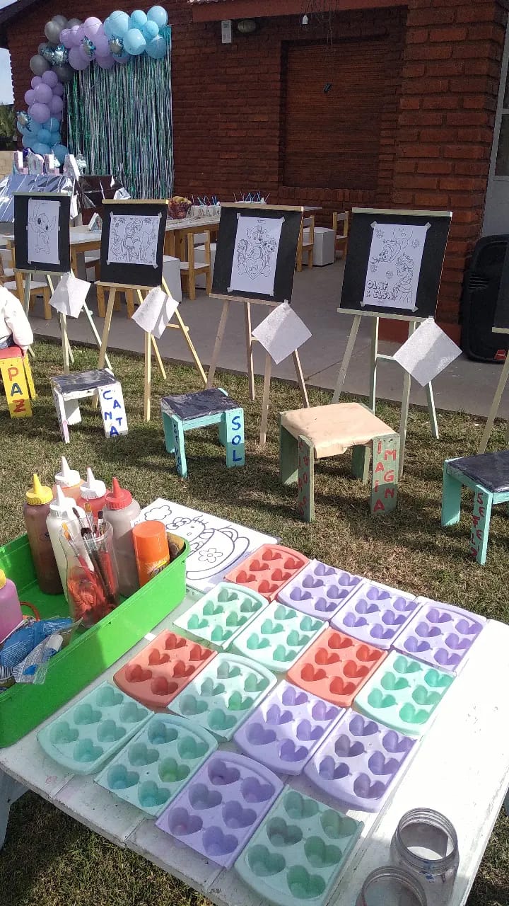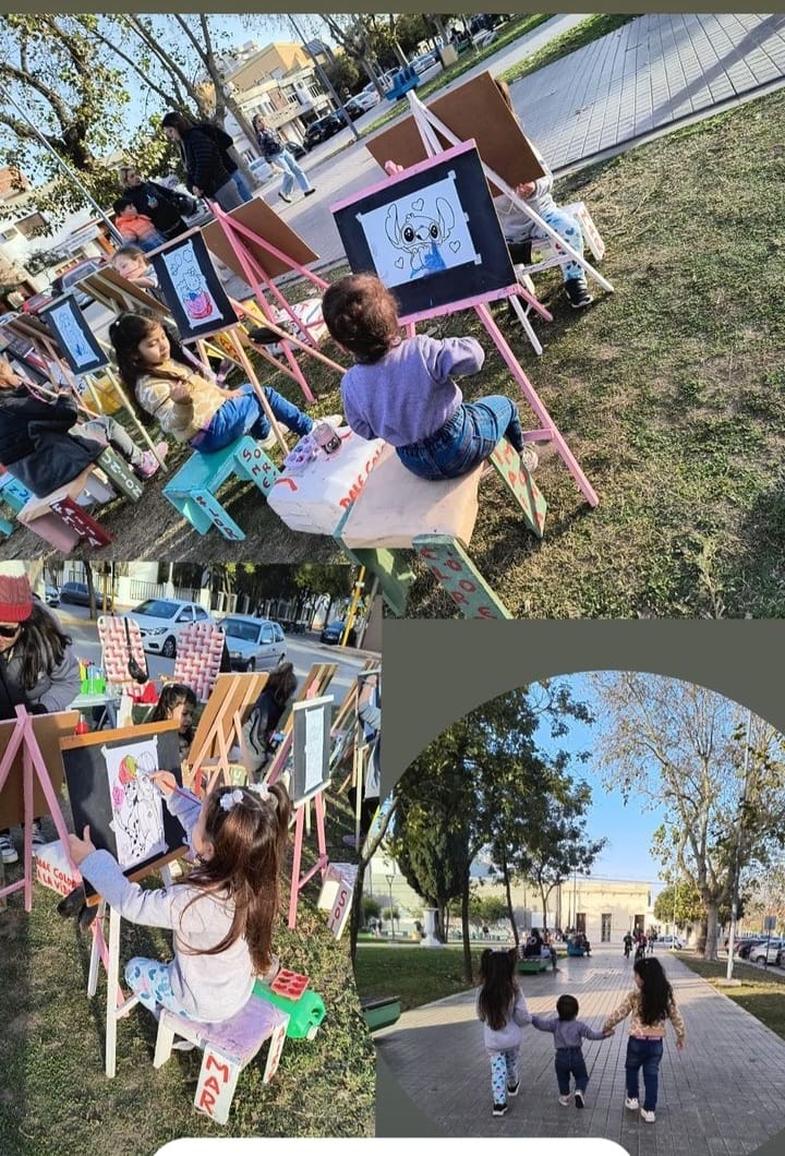 José y Paula desde hace un tiempo comenzaron un emprendimiento , colocando atriles en la plaza 25 de mayo e invitando a los niños a que pinten con temperas , el dibujo que más les gusta , de las decenas de opciones que tienen .