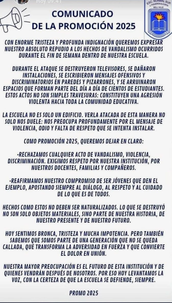 Fueron muchos los comunicados y muestras de repudio hacia este episodio triste y por el oscuro motivo que tuvieron los vándalos . Compartimos aquí un comunicado de los alumnos del último curso .