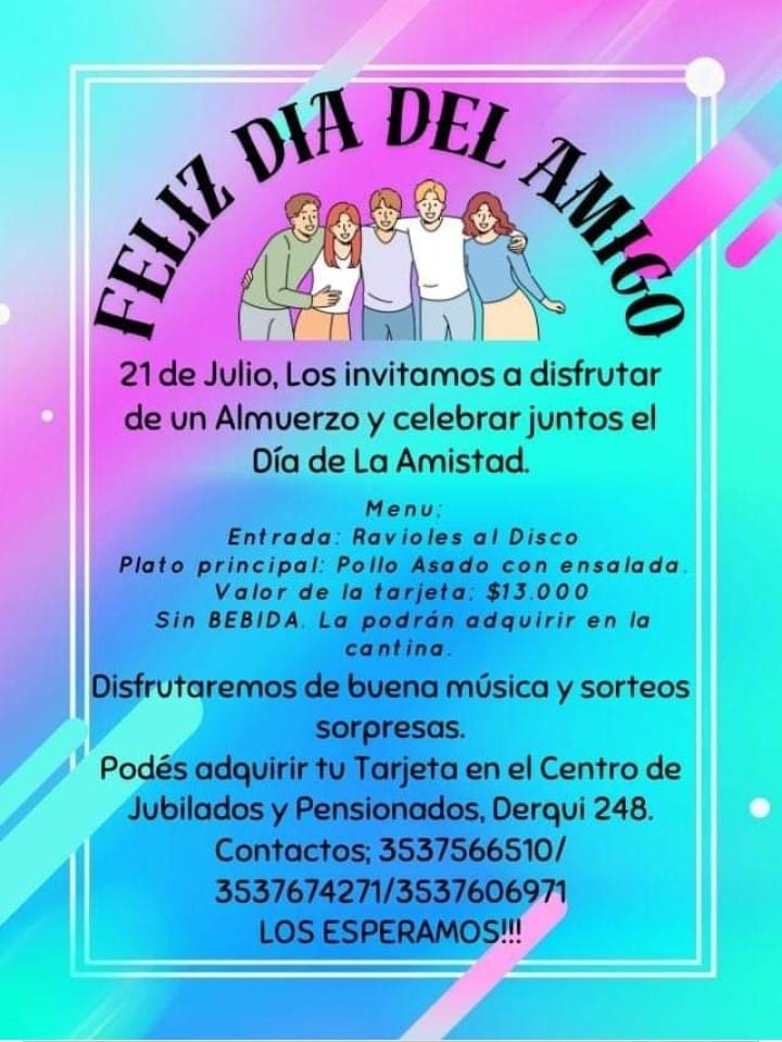 Con una muy buena excusa como es reunirse y festejar el Día de la Amistad , el Centro de Jubilados organiza para el próximo domingo 21 de julio un gran almuerzo que tendrá un menú muy atractivo , ravioles al disco y pollo asado con ensalada.