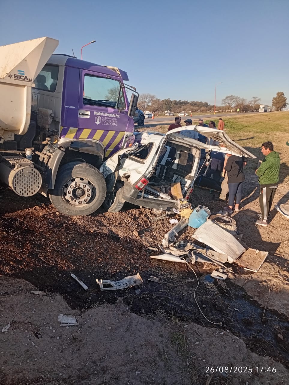 Se comisiona personal policial, tras alerta al número de emergencias, en ruta provincial Nº 2, acceso oeste de la localidad, constatando un accidente de tránsito, donde por causas a establecerun camión Volkswagen, tipo volcador conducido por un ciudadano de 44 años de edad, colisiona con un vehículo utilitario marca Peugeot Partner, guiado por un masculino de 52 años de edad, acompañado por una femenina de 82 años de edad. A raíz del siniestro todos los involucrados fueron trasladados al hospital de la ciudad de Bell Ville, donde tras ser asistidos por personal médico, se diagnostica lesiones de carácter leves para el conductor del camión y para la femenina acompañante del rodado menor, en cuanto al conductor de este último (peugeot partner), permanece internado en observación, habiendo sufrido varias lesiones, y heridas cortantes, sin correr riesgo de vida. Trabajaron en el lugar servicios de emergencia, bomberos voluntarios y policía judicial, con conocimiento e intervención del magistrado judicial interviniente.